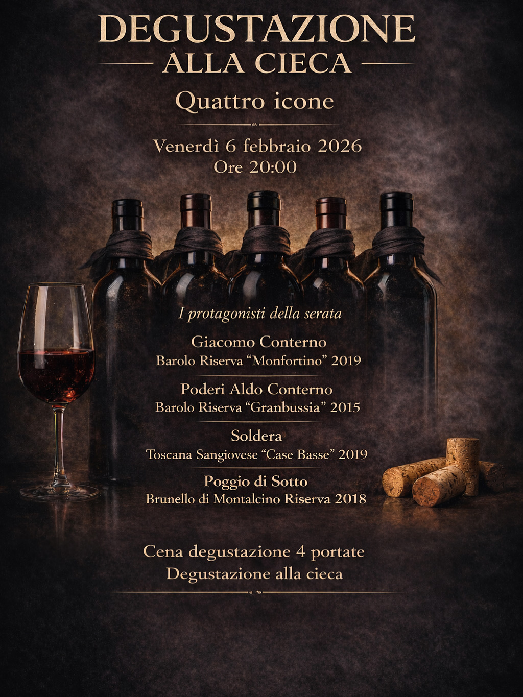 Venerdì 6 febbraio 2026 – ore 20:00 Quattro vini simbolo. Quattro interpretazioni assolute. Un solo giudizio: quello del calice. In degustazione alla cieca